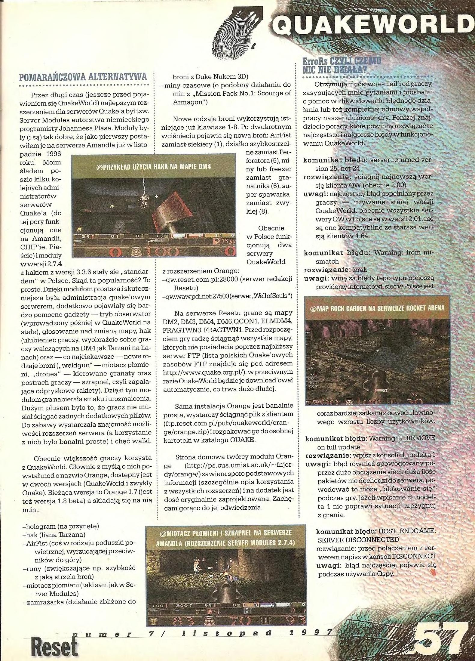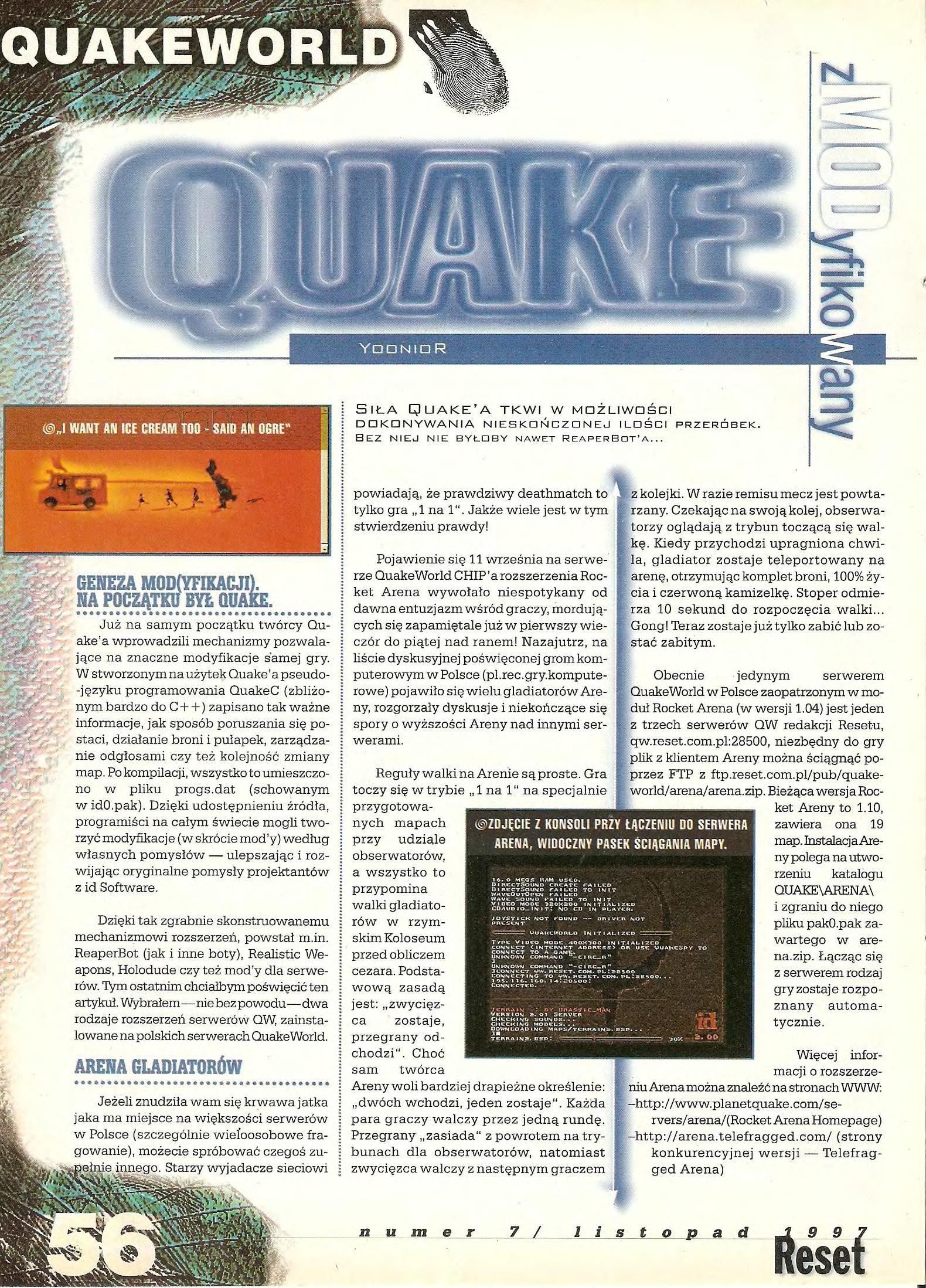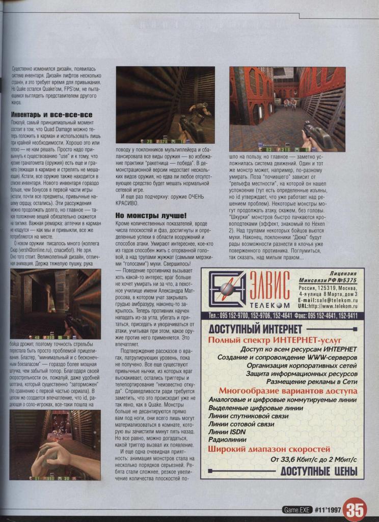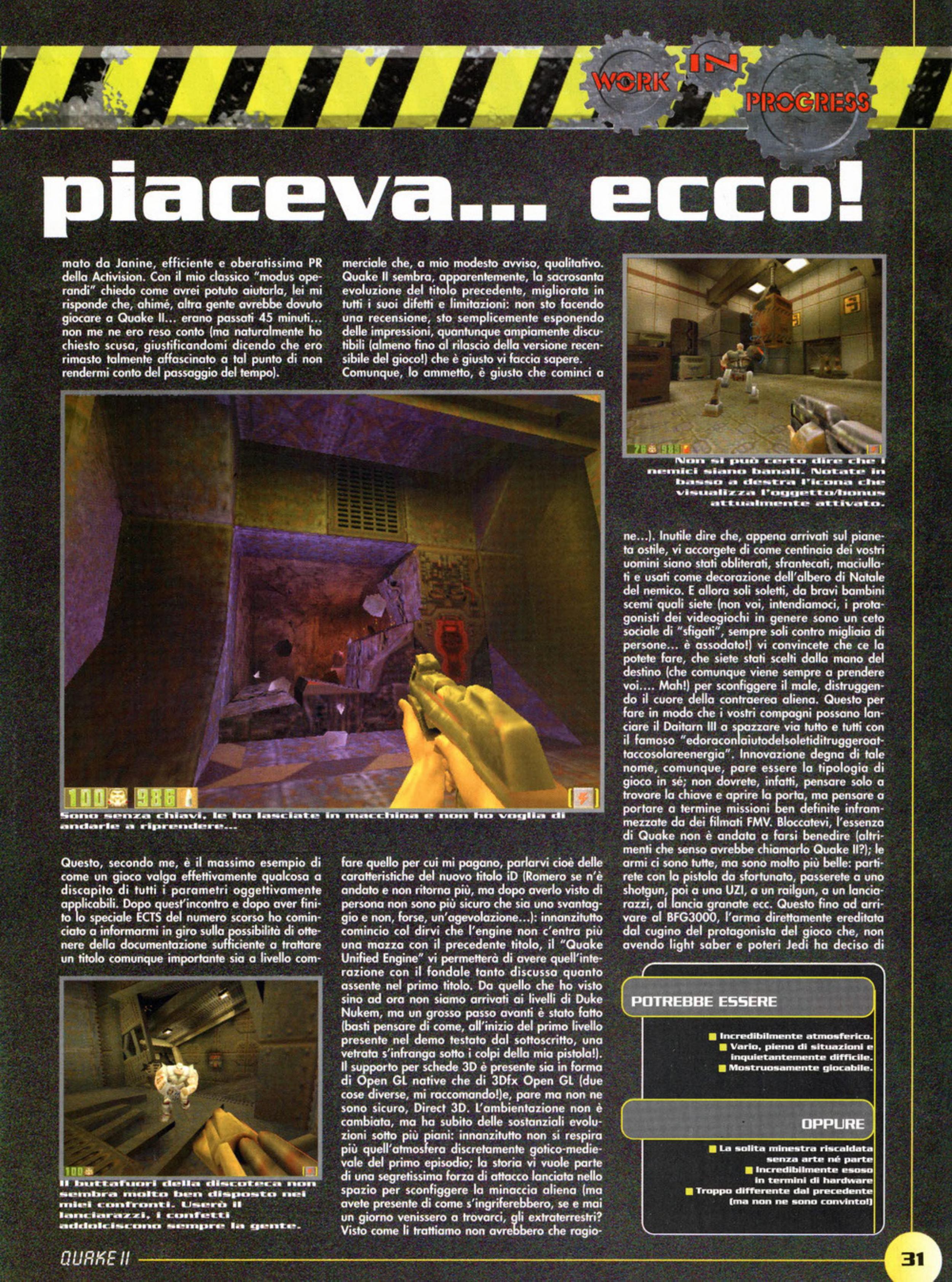 “But all this has changed. The engine is smoother and faster. The sound code is better. There’s coloured lighting and translucent walls and floors. There are shadows — real-time shadows. Objects can rotate on any axis and the levels are twice as big, if not in square footage then certainly in intricacy. And then there are units instead of episodes. Each unit has multiple levels, and each level has different goals and objectives. It’s John Carmack, owner and coder at iD, who you should thank for all this technological advancement. ‘John’s the pimp,’ says Willets. ‘He’s so good.'”