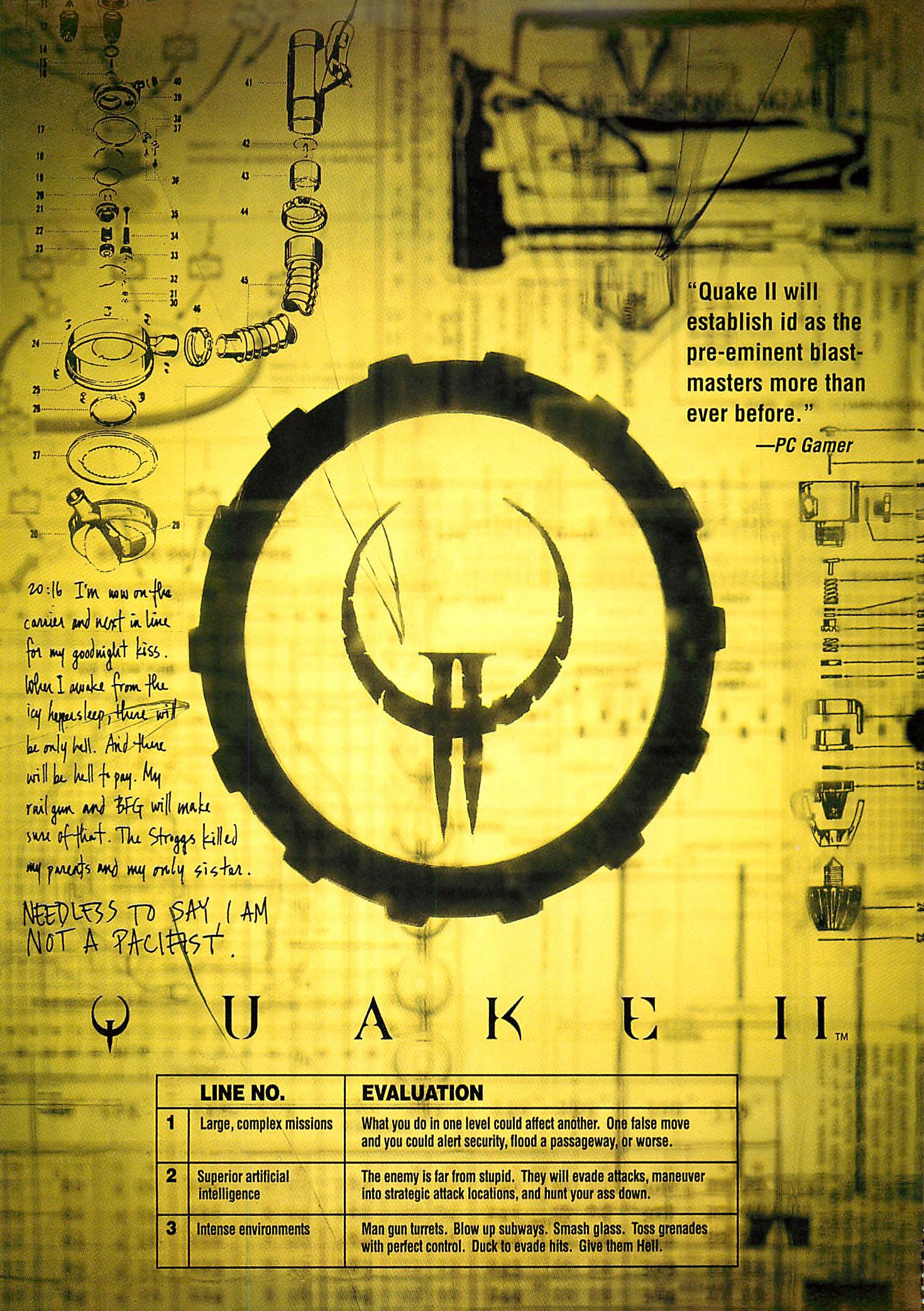 “ALIEN SCUM CAN KISS THE BUTT OF MY RAILGUN. Orders come in from the brass this morning. Tonight, I’ll be on the C-30K Marine Carrier with the rest of 101st Spaceborne. A little hypersleep, a couple thousand gallons of rationed I.V. Nourishment, a few hundred light years, and we’ll be knee-deep in Strogg blood.”