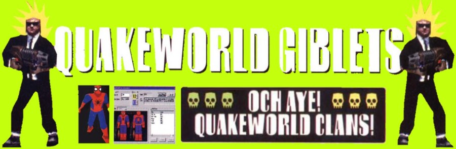 "QuakeWorld Giblets: Quake truly is one of the most important video games ever. Not only is a brilliant one-player game, a magnificent multi-player game, and completely customizable, but it's also the first to have such an impact on world-wide internet gaming. QuakeWorld is the new free upgrade which shows us the true future of video games. You can look however you want, you can call yourself whatever you want, you can travel the world from your bedroom, and you can conquer QuakeWorld with your clan of killers! In QuakeWorld, you get to be what you always wanted to be – in real life you may be a 10-year-old in a wheelchair, but in QuakeWorld you can be Baron Rocketdeath – one of the most feared warriors in the world, taking on anyone who dares challenge you, while looking like the hardest person anyone's ever met. Soon, all video games will be like this."