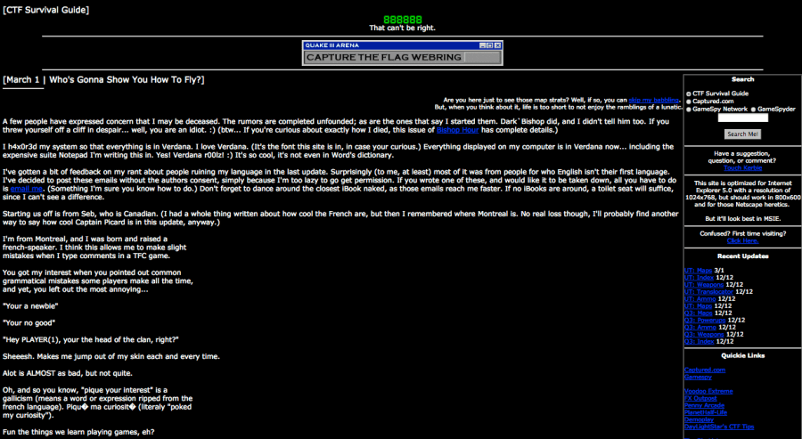 "The object of any game is to win. In this mod the objective is no different. To win your team has to score points. To score points you have to meet certain objectives… number one is capturing the flag. To capture the flag there are certain conditions that have to exist: If you are on the female team then your flag is blue. If you are on the male team your flag is red. So if you are on the blue team (female) then you want to go get the red flag."