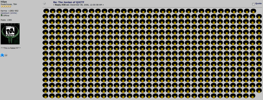 From the AcmeCTF.com forum thread: http://www.acmectf.com/forum/index.php/topic,2154.0.html ezmonster wrote: The Jordan of Q2CTF « on: December 02, 2006, 07:43:19 PM » This is some funny shiznit I found on someone's blog (posted December 2005). Apparently someone who had heartburn from too many taters owned $lasher, "the Jordan of Q2CTF" -------------- At home afterwords the mashed potatos I'd …