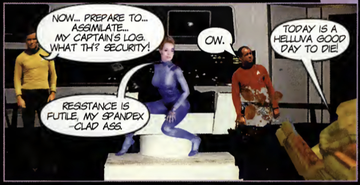 "Set your phasers to 'Oh shit!', here comes Klingon Honour Guard. Some people have said that PC Zone writer Steve Hill looks a bit like a Klingon. As a result, he hates Star Trek; but he can't get enough of MicroProse's new first-person shooter."